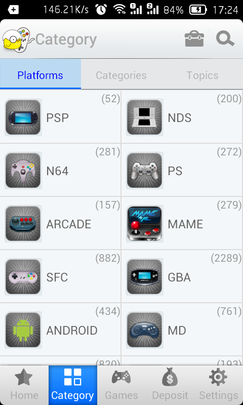 Atualmente suporta Arcade (MAME), GBA, GBC, SFC (Super Nintendo SNES) , FC (NES), MD (SEGA Mega Drive), a Sony PS1 etc jogo simulador.